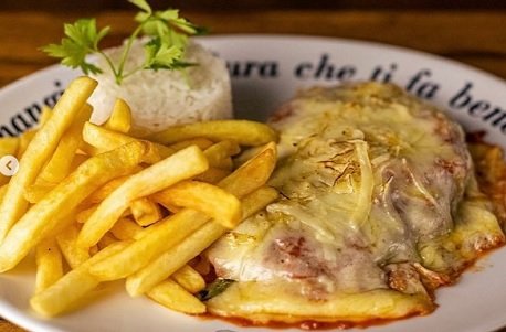 Esse é o campeão do “italianos” que simplesmente não existe por lá. O prato é uma adaptação da berinjela à parmegiana, que é feita com um bife e muiiiiito molho de tomate.