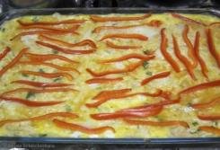 No fundo de um refratário, untado com óleo, distribua as batatas em rodelas, cubra com o creme de frango, regue por cima os ovos batidos e finalize com as tiras de pimentão
