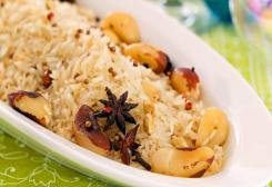 2. Acrescente as especiarias e mexa por 30 segundos. Junte o arroz e continue mexendo por 2 minutos.