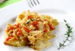 Cozinhe o lombo de bacalhau (já dessalgado) em água fervente por cerca de 3 minutos. Retire a pele e as espinhas, dividindo o lombo em lascas grandes. Em uma panela, faça uma camada com rodelas de batata, tomate, cebola e bacalhau. Repita as camadas nessa ordem até utilizar todos os ingredientes. Coloque o louro, o alecrim, a pimenta branca a gosto e regue com o vinho branco e o azeite. Leve a panela ao fogo baixo, destampada, para que cozinhe lentamente e o excesso de liquidos evapore, deixando a mistura mais grossa. Assim que as batatas estiverem macias, retire do fogo e saboreie com um bom vinho. Português, claro…