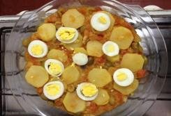 Em um refratário espalhe o bacalhau, por cima coloque as batatas cozidas picadas e acrescente o molho