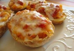 Recheie as batatas com este preparado. Coloque depois o restante molho de tomate sobre as batatas, assim como o restante queijo.