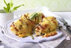 Espete em cada batata, nos cortes, 3 folhas de sálvia e 3 pedaços de presunto. Tempere com sal e pimenta.