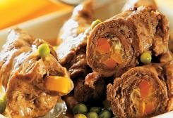 Tempere os bifes com o alho, o sal e a pimenta-do-reino. Distribua sobre cada bife as folhas de sálvia, as tirinhas de pimentão, de cenoura e de salsão. Enrole os bifes e feche com palitos. Em uma panela média, aqueça o óleo e doure os rolês. Junte a cebola e refogue por 5 minutos. Coloque água fervente suficiente para cobrir a carne e cozinhe até ficarem macios. Retire-os da panela e reserve. Mantenha a panela no fogo e, ao caldo, acrescente a ervilha, o molho inglês e a farinha de trigo diluída em 1/4 de xícara (chá) de água. Mexa até engrossar e sirva sobre os rolês.
