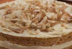 Corte o bolo ao meio, recheie com metade do beijinho, cubra com o restante e decore com fitas de coco.