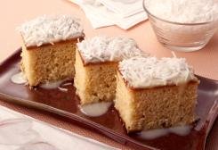 Misture o leite condensado com o leite de coco e o suco. Retire o bolo do forno, desenforme e remova o papel. Regue com a mistura de suco e polvilhe o coco. Sirva frio.