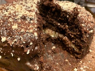 Uma delícia de bolo fofinho com recheio de chocolate branco e chocolate escuro.