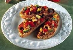 Fate tostare le fette di pane nel forno già caldo a 200 °C per qualche minuto, quindi strofinatele con l’aglio sbucciato. Trasferite le bruschette su un piatto da portata, distribuitevi sopra il misto di verdure, irrorate con l’olio rimasto e servite.