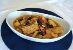 Pulite il pesce, tagliatelo a pezzi e lavatelo bene. In una casseruola di terracotta fate soffriggere con l’olio lo spicchio d’aglio intero e la cipolla; quando l’aglio è colorito, toglietelo e unite le acciughe, il prezzemolo e, in ultimo, i pomodori.