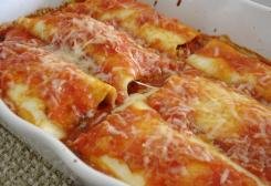 Distribuite il ripieno sui quadrati di pasta ed arrotolateli a cannolo. Versate qualche cucchiaio di salsa sul fondo di una porcellana da fondo unta, accomodatevi i cannoli ben accostati, ricopriteli con la salsa rimasta ed i fiocchetti di burro. Infornate a forno preriscaldato a 180° per un quarto d’ora, cospargete con il parmigiano e proseguite la cottura ancora per 5 minuti.