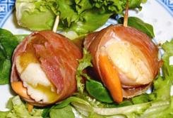 Preriscaldate la griglia, o preparate delle braci. Cospargete le capesante con succo di limone. Tagliate il prosciutto a strisce nel senso della lunghezza. Avvolgete una striscia di prosciutto intorno ad ogni capasanta. Infilzatele su 8 spiedini.