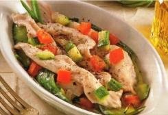 Mettete le zucchine a fette in una teglia antiaderente spennellata d’olio, adagiatevi sopra le fettine di cappone sgocciolate dalla marinata e fatele cuocere nel forno già caldo a 180 °C per 5 minuti.