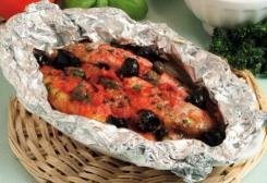 Ricoprite i pesci con la salsa rimasta, distribuitevi sopra qualche oliva nera snocciolata, i capperi sgocciolati e il prezzemolo lavato e tritato, quindi irrorate con un filo d’olio d’oliva extravergine e chiudete il foglio di alluminio.