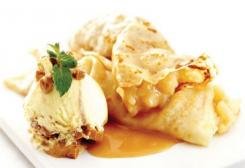 Confeccione os crepes com manteiga clarificada numa frigideira antiaderente. Coloque os frutos salteados no centro dos crepes. Polvilhe com açúcar em pó e leve ao forno quente (1 min.). Sirva com o suco das cascas e Carte DOr Crème Caramel.