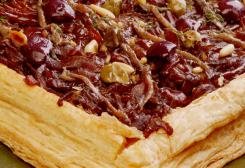 Doure o alho no azeite restante e escorra em papel absorvente. Estique a massa folhada em retângulo e pincele a gema. Preaqueça o forno a 180 graus C e asse a massa por 20 minutos ou até dourar. Deixe esfriar.