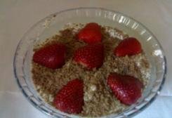 Numa tijela, pôr um pouco de natas, raspas de chocolate, morangos, bolacha, o resto das natas, raspas de chocolate e enfeitar com uns moranguitos.