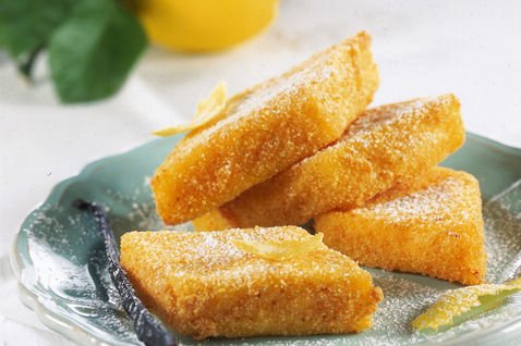 Quando saranno freddi, tagliare a rombi di circa 5 cm e passarli negli albumi sbattuti e nel pangrattato. Friggere i rombi . Servire caldi. Cospargere di zucchero a velo.
