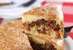 6. Coloque metade da massa, o recheio e cubra com o restante da massa.