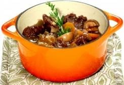 Quando a carne estiver cozida, lave os cogumelos sob água corrente, seque bem e corte-os em metades. Acrescente ao ensopado e deixe cozinhar até que a carne esteja macia e o molho tenha engrossado. Verifique os temperos e desligue o fogo. Coloque a manteiga gelada cortada em cubinhos, misture bem e sirva a seguir.