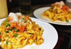 Aggiungere il pomodoro e proseguire fino a metà cottura. A questo punto unire i piselli e a cottura ultimata la panna. Mantecarvi le fettuccine e servire ben caldo.