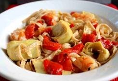 Far appassire l’aglio tritato in una padella con l’olio, aggiungere gli spicchi di carciofo scolati, farli rosolare, insaporire con sale e pepe, unire i pomodori, 3-4 cucchiai del liquido di cottura dei cannolicchi e cuocere per 15 minuti a fuoco moderato; aggiungere infine i cannolicchi, il prezzemolo e il basilico tritati. Far cuocere la pasta, scolarla, unire il condimento caldo, mescolare e servire.