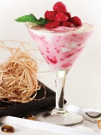 Ritirare il siero dallo yogurt lasciandolo scorrere da un filtro di carta per 15 min. Unire il dolcificante e frullare rapidamente oppure usare una frusta manuale. Mettere nel freezer per 2 ore. Ritirare e mescolare la polpa con un cucchiaio per un effeto marmore. Mettere nuovamente nel freezer per 30 min. Versare nelle coppe e guarnire con frutti rossi e la menta. Servire subito.