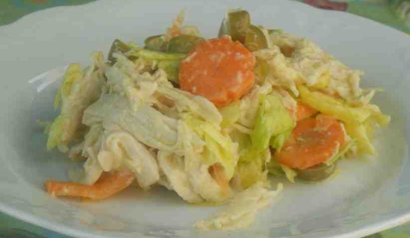tagliare a sottile strisce il petto di pollo, pulire il lattughino, scolare, disporre su un piatto ovale e al centro sistemare le strisce di pollo. Scolare i chicchi di mais e versarli in una terrina, unire il cuore di sedano tagliato a fettine, le carotte grattugiate, il cipollotto affettato sottilmente e condire con gli ingredienti indicati. Sistemare queste verdure in un piatto da portata e decorare con fettine di cetriolo e olive.
