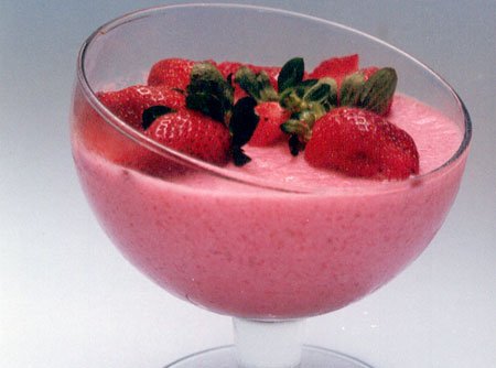 Bata no liquidificador a mistura de leite desnatado e iogurte, a gelatina diet de morango, os morangos, o leite condensado diet e a ricota peneirada.