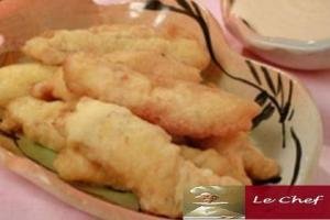 Depois empane as tiras de peixe em farinha de trigo e frite em óleo bem quente.