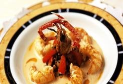 Limpe o lagostim e reserve as cascas. Refogue as cascas na metade do azeite por cinco minutos. Junte a cenoura, o alho-poró, o salsão e a échalote, tampe e cozinhe por cinco minutos.