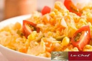 Transfira para uma prato de servir e decore com o tomate e o ovo.
