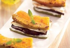 Corte os legumes em tiras retangulares (nem muita finas nem muito grossas) e tempere com sal e pimenta. Em uma frigideira antiaderente, grelhe uma a uma até dourar (sem azeite ou óleo), dos dois lados. Monte em camadas, alternando os legumes de acordo com as cores, e coloque uma camada fina de coalhada entre eles. Regue com o azeite e decore com o manjericão. Sirva frio ou morno.