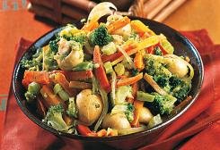 Em uma panela aqueça o óleo. Ponha as cenouras, a cebola e os brócolis e cozinhe por quatro minutos, sem parar de mexer. Tempere com o sal. Junte o açúcar e os cogumelos com o líquido do vidro. Cozinhe até que os legumes estejam macios.