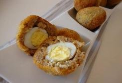 Envolva cada ovo num pedaço de carne de moda a ficar com uma espécie de almôndega recheada com o ovo. Deverá fazer 6 almôndegas grandes.