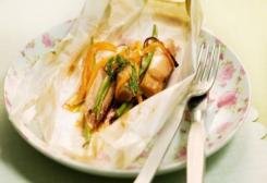 Ao fechar os papillotes, deixe um espaço entre o alimento e o pacote: nesse espaço o alimento quente solta o vapor (da água que os ingredientes contém) que cozinha os legumes.