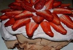 Espalhe as natas por cima do merengue e enfeite com morangos.