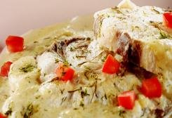 6. Devolva o molho ao fogo e acrescente o creme de leite, o dill, o sal e a pimenta. Deixe engrossar ligeiramente e ponha o peixe.