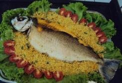 Depois de recheado feche o papel alumínio, coloque o peixe embalado em uma assadeira e leve ao forno pré aquecido (pré-aqueça o forno por uns 5 minutos), depois de colocar o peixe no forno deixe-o em temperatura baixa por uns 40 minutos