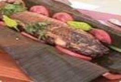 Amarre bem com um barbante. Pegue uma folha de bananeira, limpe-a e coloque no calor da chama do fogão até amolecer. Cuidado para não queimar. Passe azeite na folha, enrole o peixe e dobre as pontas para não vazar. Coloque sobre uma telha e leve ao forno por 40 minutos, em temperatura alta (290ºC).