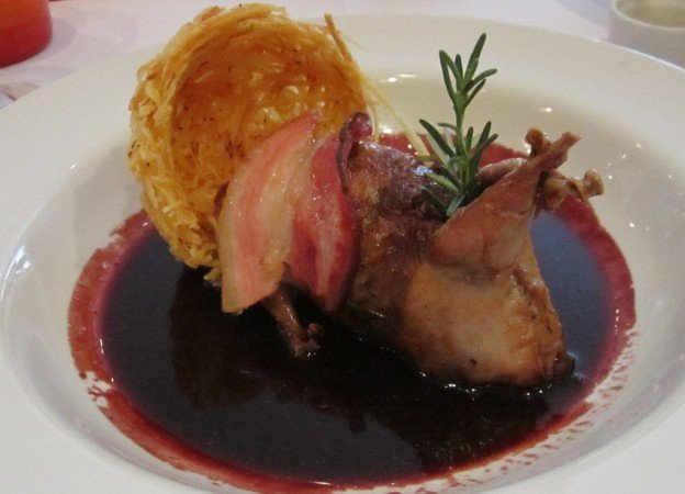 Distribua a perdiz, os legumes e os cogumelos num prato e regue com o molho.