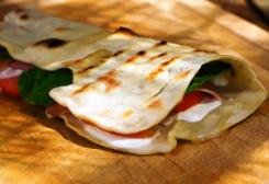Farcite la piadina tiepida con il prosciutto crudo e le fette di pomodoro e mozzarella alternate e leggermente sovrapposte. Condite con sale e olio d’oliva e terminate con le foglioline di basilico ben lavate e asciugate. Chiudete la piadina a libro e mangiatela subito.