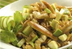 Fate abbrustolire i pinoli per qualche minuto in forno a 200° C, scolate, asciugate e strizzate l’uvetta. Riunite in un’insalatiera il pollo, l’avocado, i pinoli e l’uvetta, condite con l’olio alla senape, il sale e servite.