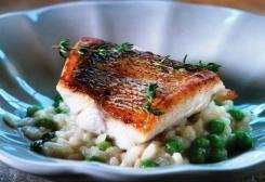 Nel frattempo spennellate con l’olio rimasto una padella antiaderente, fatela scaldare, adagiatevi i pezzetti di pesce, fateli rosolare per 2-3 minuti a fuoco vivace e uniteli al riso circa 5 minuti prima del termine della cottura.