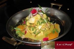 Para a montagem, coloque o robalo marinado em um recipiente e finalize com a cebolinha e o coentro, para decorar.