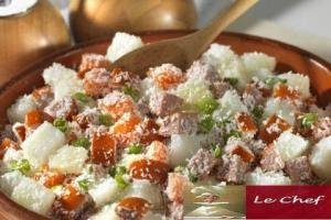 Em uma tigela, misture as batatas, a cenoura e as salsichas. Junte o sal, o Coco Ralado Ducoco® Desidratado, a cebolinha e misture bem. Dica