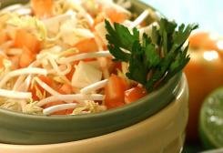 Ponha o broto de feijão em uma saladeira e junte os tomates e o palmito cortado em cubinhos. Misture o suco de limão, o molho de soja, o azeite e o sal e regue a salada no momento de servir. Receita do M de Mulher