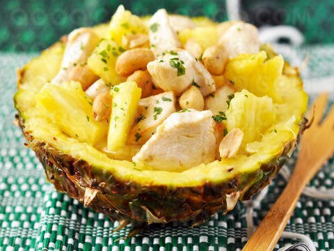 Cortar os pedaços de frango, tirando a pele e dando uma fervida de 2 minutos. Tire para desfiar graúdo, acrescente as batatas cozidas em cubos, o abacaxi escorrido e em pedaços pequenos, as maçãs ácidas em cubos, e o restante. Ponha 2 colheres de sopa do caldo do abacaxi, um pouco de sal, misture bem e ponha na geladeira até servir.