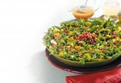Coloque em uma saladeira sobre as folhas de alface e rúcula. Sirva a seguir.