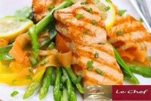 Coloque o refogado de aspargos no prato e, sobre ele, o peixe grelhado.