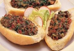 Corte os pãezinhos ao meio no sentido do comprimento. Retire o miolo e deixe uma casca com cerca de 0,5 cm. Esmigalhe o miolo do pão. Coloque-o numa vasilha e junte a água, a salsa, a mostarda, o ovo, o orégano e a pimenta. Misture bem. Aqueça o forno em temperatura alta. Doure a linguiça em duas colheres (sopa) de manteiga. Junte a carne, a cebola e o alho. Mexa bem até que a linguiça e a carne estejam cozidas. Escorra o excesso de óleo e acrescente à mistura de ovo. Divida entre as metades de pão e ponha numa assadeira sem untar. Derreta a manteiga restante e pincele sobre o recheio. Asse por 15 minutos ou até dourar.